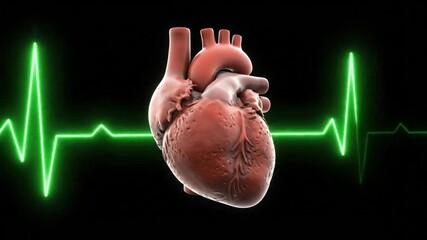 Realistic 3D heart with glowing green heartbeat graphic on black background simulating medical examination