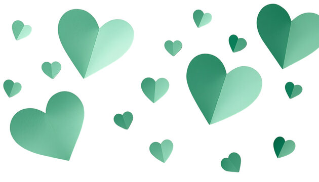 A close-up shot of multiple green hearts against a blue backdrop with a soft green wall in the background