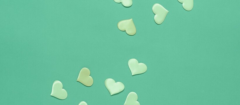 Green hearts on a green pastel background. Valentine's Day. Top view, flat lay, copy space. Banner