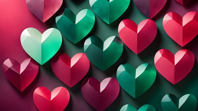 A vibrant collection of red and green hearts on a dark green background, perfect for Valentine's Day promotions, wedding invitations, or themed love celebrations.
