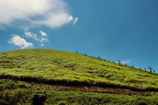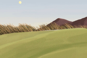 A field of delicate white margaritas stretches towards a rolling green hill, peaceful, landscape