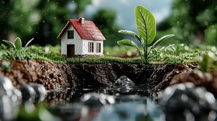 Pixel Art White House with Red Roof Over Green Hill Next to Stream