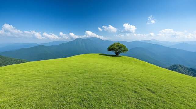 A serene and vibrant scene with a single large tree standing on a lush green hill under a bright blue sky with scattered white clouds.