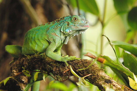 Full body image of a green iguana (iguana iguana) on a white background The long body of an iguana and a crest that has a clear sawtooth appearance along the back.