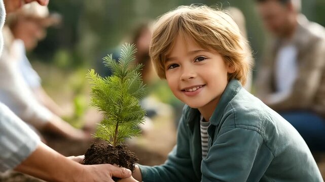 Happy child planting, tree with community, environmental stewardship moment, green initiative participation, intergenerational cooperation, ecological education activity, nature co