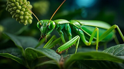 Close-up of a shiny green insect with red eyes, perched on a vibrant leaf