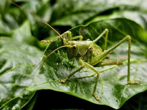 Sickle-bearing bush-cricket Phaneroptera falcata of Tettigoniidae is a green insect with long antennae. This is an authentic optical photography captured on location