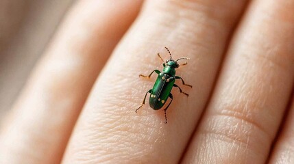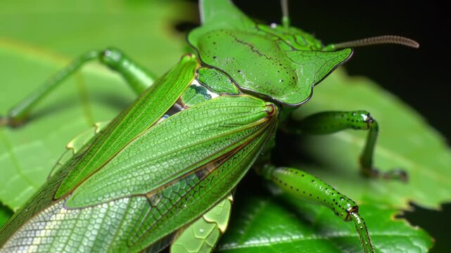 Close-up of a vibrant green insect with long antennae, posed on a surface