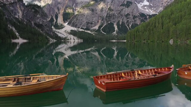 Revealing drone flight over floating wooden rowing boats and emerald green lake (Lago di Braies) towards beautiful moody mountain ranges in the Dolomites in Italy