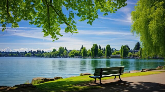 Lush green lake surrounded by towering mountains, with serene water lilies and scattered rocks in the foreground. with copy space image. Place for adding text or design