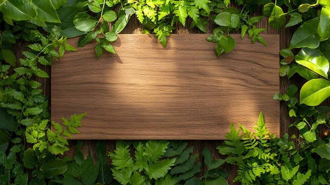 Wooden Board Surrounded by Lush Green Leaves and Ferns