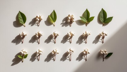 Grid of green leaves and white flowers on light surface