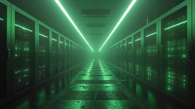 Futuristic Data Center Hallway with Rows of Servers and Green Lights
