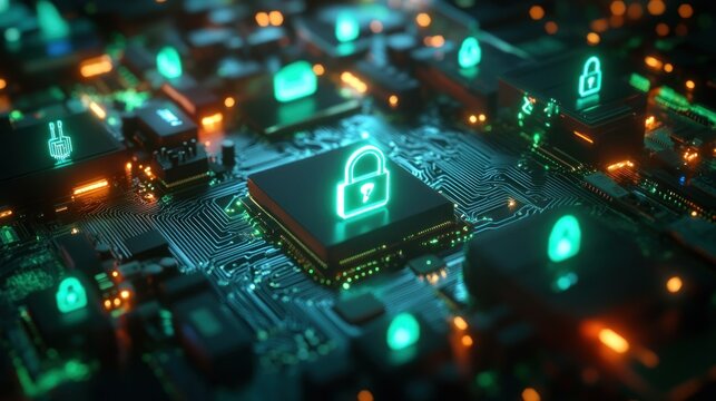 A hand is pointing to a green lock on a computer screen. The lock is glowing and he is a security feature