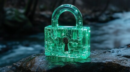 Glowing green lock symbol with futuristic design is surrounded by dynamic light streaks, symbolizing digital security and data protection