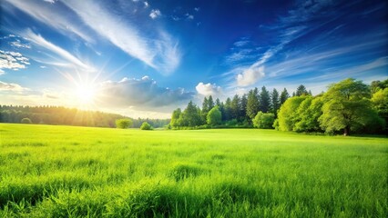 Magnificent scenery of green meadow under blue sky on sunny day in countryside