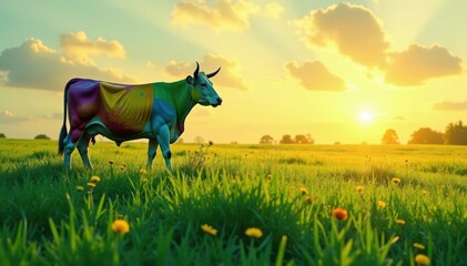A vibrant green meadow with a bright blue sky and a sun shining down.