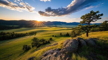 Sunset over a peaceful mountain valley with rolling green meadows, trees, and rocky outcrops
