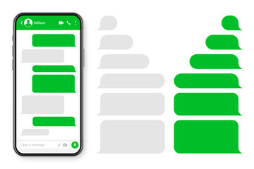 Realistic smartphone with messaging app. Blank SMS text frame. Conversation chat screen with green message bubbles. Social media application. Vector illustration.