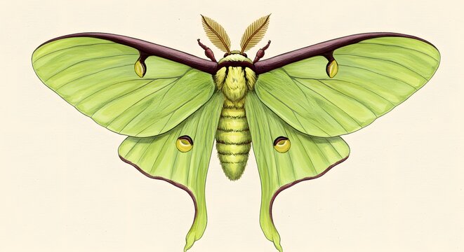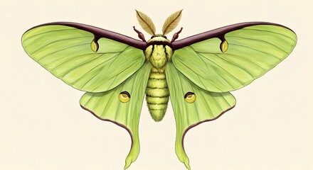 Isolated Luna moth close-up, a large, pale green moth with eyespots on its wings beautiful insect