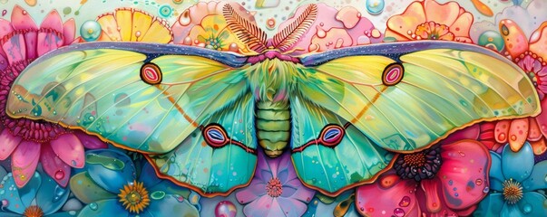 Vibrant green moth with detailed wings, surrounded by colorful flowers