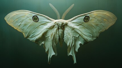 Close-up of a large, pale green moth with prominent eyespots on its wings, displayed against a dark background.
