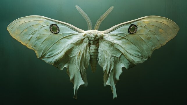 Closeup macro shot of a stunning green moth adorned with iridescent, jewellike scales, showcasing intricate details and vibrant colors