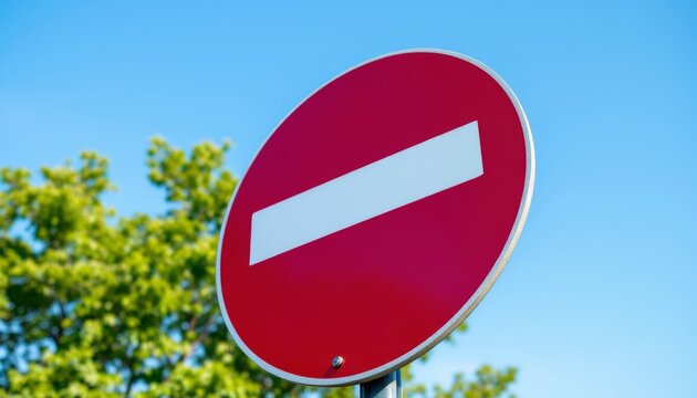 A red and white no entry road sign with green trees and clear blue sky background