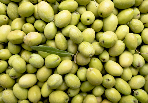Green Olives and Olive Oil Drizzle Flatlay Photography