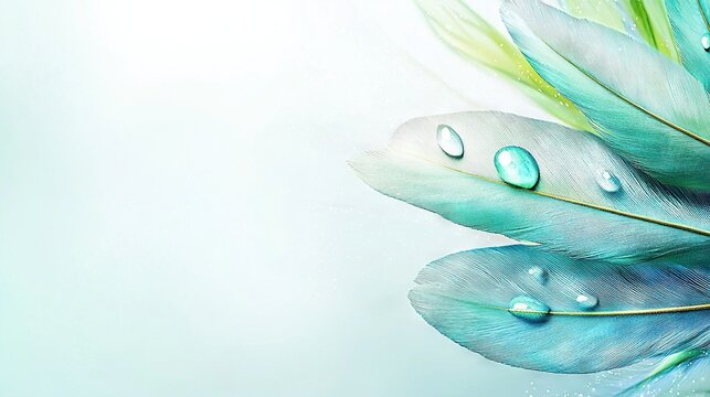 A close-up of a blue and green feather with droplets of water on its back, set against a background of water on top of the feathers