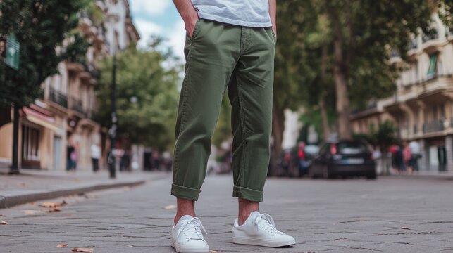 Person wearing olive green pants and white shoes on city street fashion and style concept