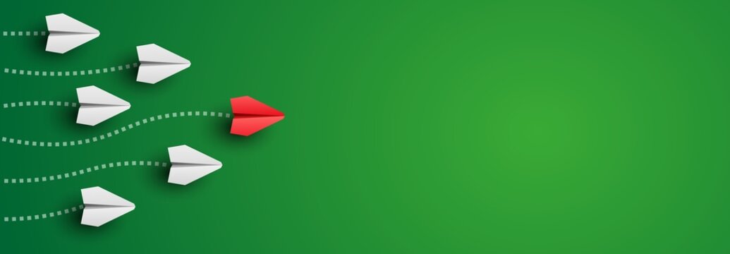 Bright green paper airplane soaring diagonally across a pale mint-green background with a shadow