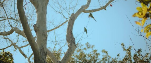 Closeup of green parakeets perching on the fibrous tree trunk clear sky background