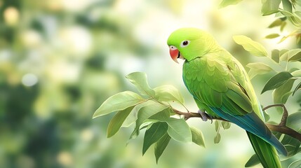 Vibrant green parrot perched on a branch with blurred green foliage in background