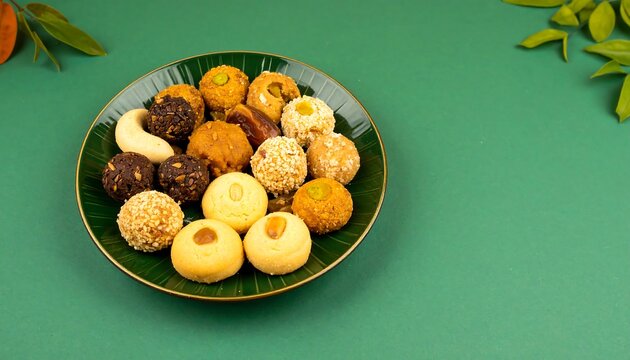 Assorted Indian sweets on a green plate
