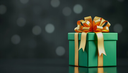 A green present tied with a red and white ribbon sits on a dark green background, conveying festive gift giving, holiday celebration, and seasonal warmth for Christmas and New Year
