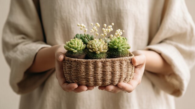 A woman holding a woven basket with tiny potted succulents as a gentle green present