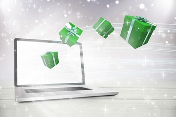 Elegant Christmas setting with green presents and festive trees, perfect for holiday celebrations and seasonal decor.