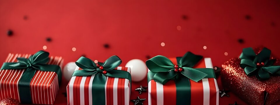 Festive red and green presents adorned with ribbons, surrounded by Christmas ornaments on a vibrant red backdrop, conveying a joyful holiday spirit,