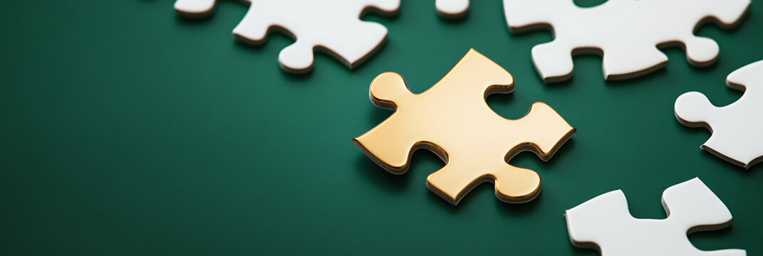 Golden puzzle piece stands out against white pieces on a dark green surface, symbolizing uniqueness, leadership, and strategic advantage in business.