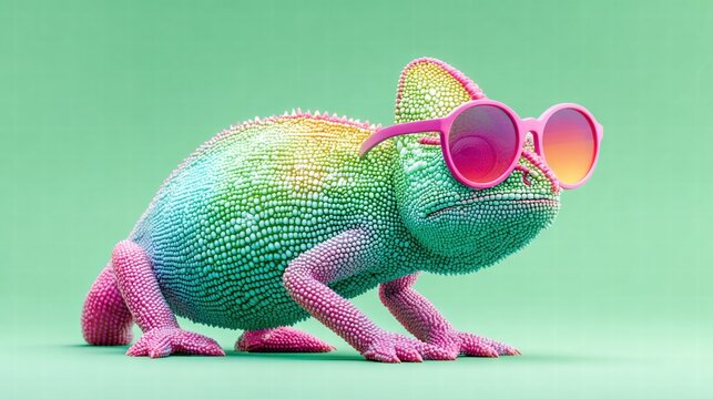 A colorful chameleon wearing sunglasses on a vibrant green background.