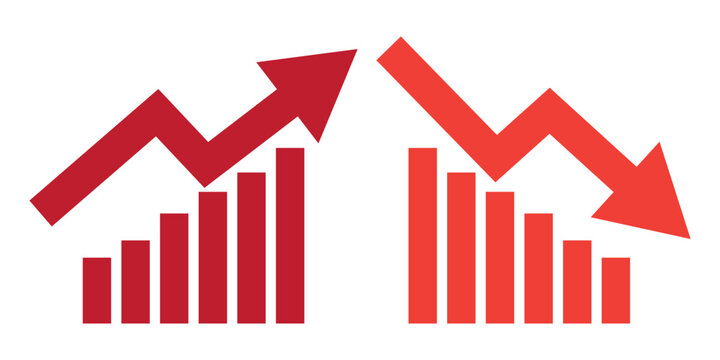 Graph going Up and Down sign with green and red arrows vector. Flat design vector illustration concept of sales bar chart symbol icon with arrow moving down and sales bar chart with arrow moving up.