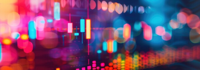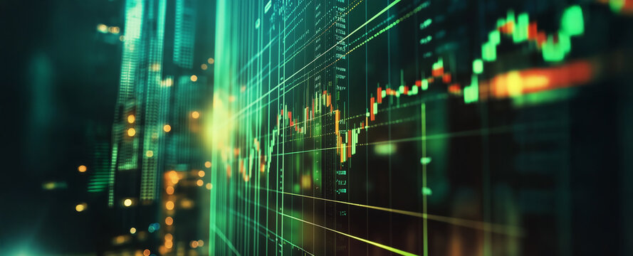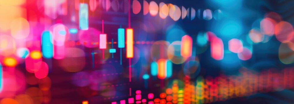 A stock market graph with red and green colors, blurred background, blurred foreground A colorful stock candlestick chart is displayed on the screen of an online trading platform Generative AI