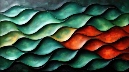 Closeup of abstract rough colorful green red colors art painting texture background wallpaper, with oil or acrylic brushstroke waves, pallet knife paint on canvas
