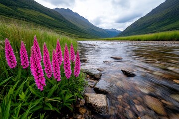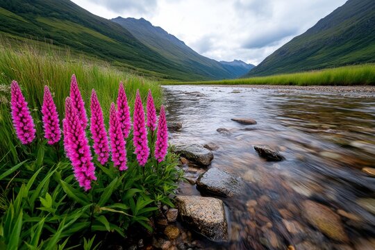 Epilobium Hirsutum (Great Willowherb) growing beside a stream, its pink flowers standing out against the green reeds