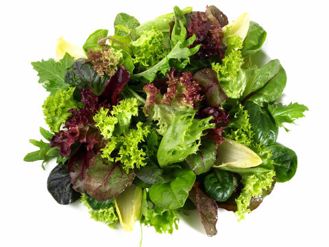 Delicious and healthy green salad of different leaves and vegetables with seeds and olive oil.