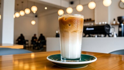 A tall glass of layered iced latte coffee on a green saucer sitting on a wooden table inside a modern cafe.