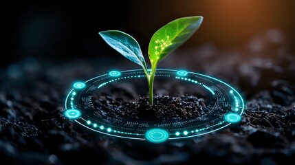 Young green seedling growing from soil with futuristic digital holographic interface surrounding it, symbolizing agricultural technology and sustainable farming.
