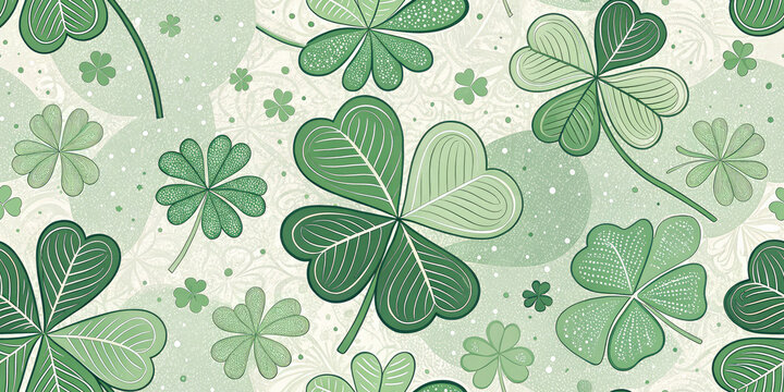 A vibrant green shamrock with four leaves stands out against a gradient background, accompanied by a swirling pattern of green leaves and a white wave-like design.