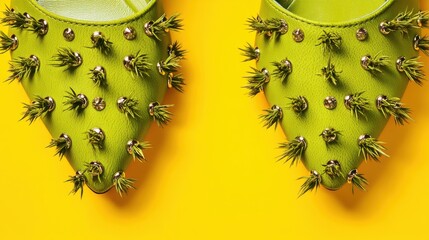 Bright Green Shoes with Spiky Accents on Vibrant Yellow Background for Fashion Forward Accessories